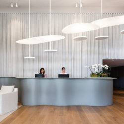 The lobby features eight original scagliola columns. The restoration of these eight-metre-high pillars has been a feat on its own. (There are only two men in the world that have the artisanal skills to complete such a job). The striking ruby red columns beamed above the marble floors, finished off with the glass brick atrium ceiling.
